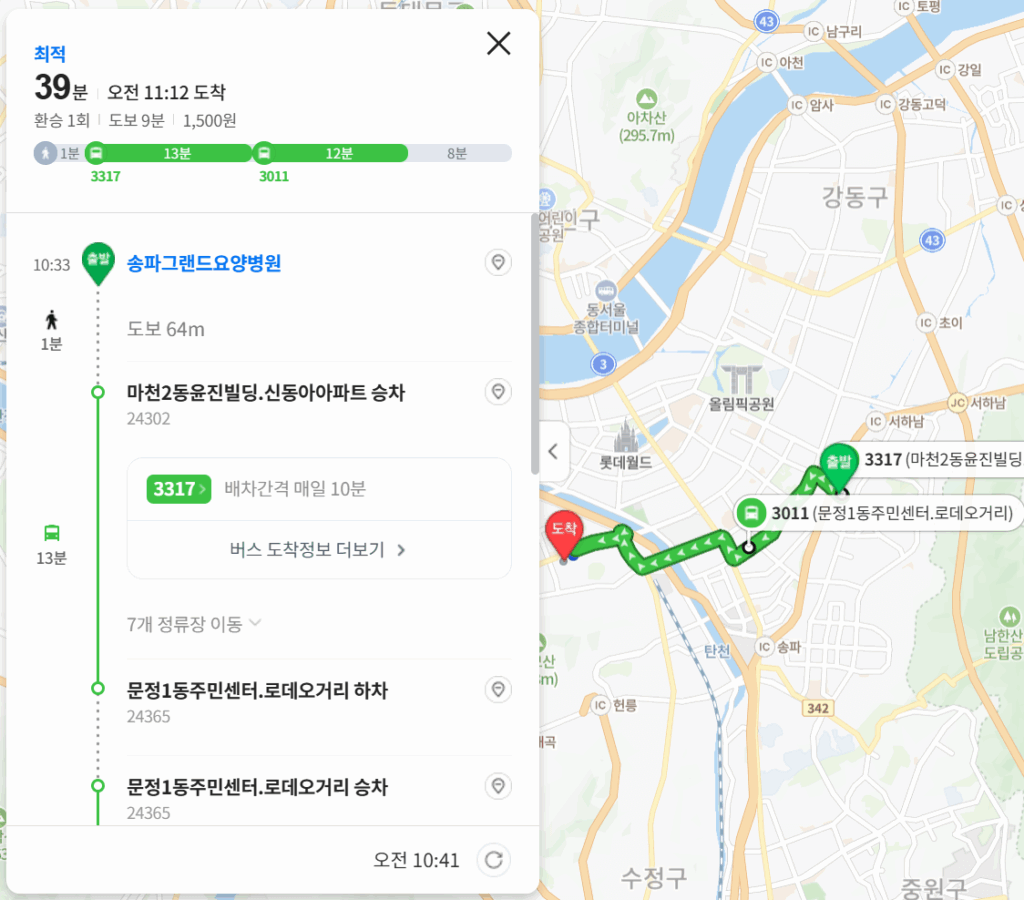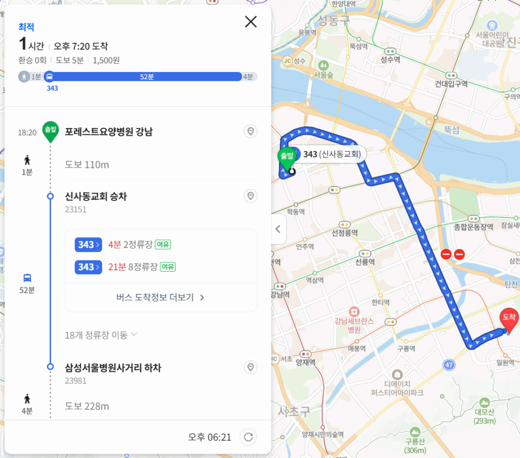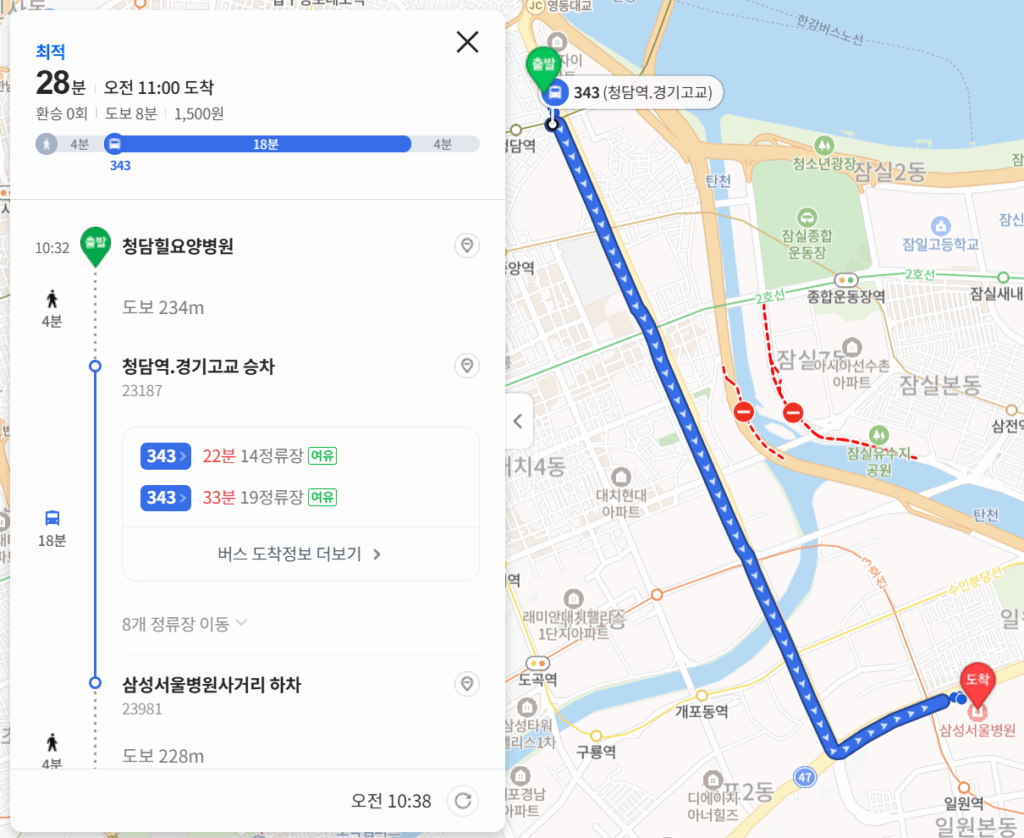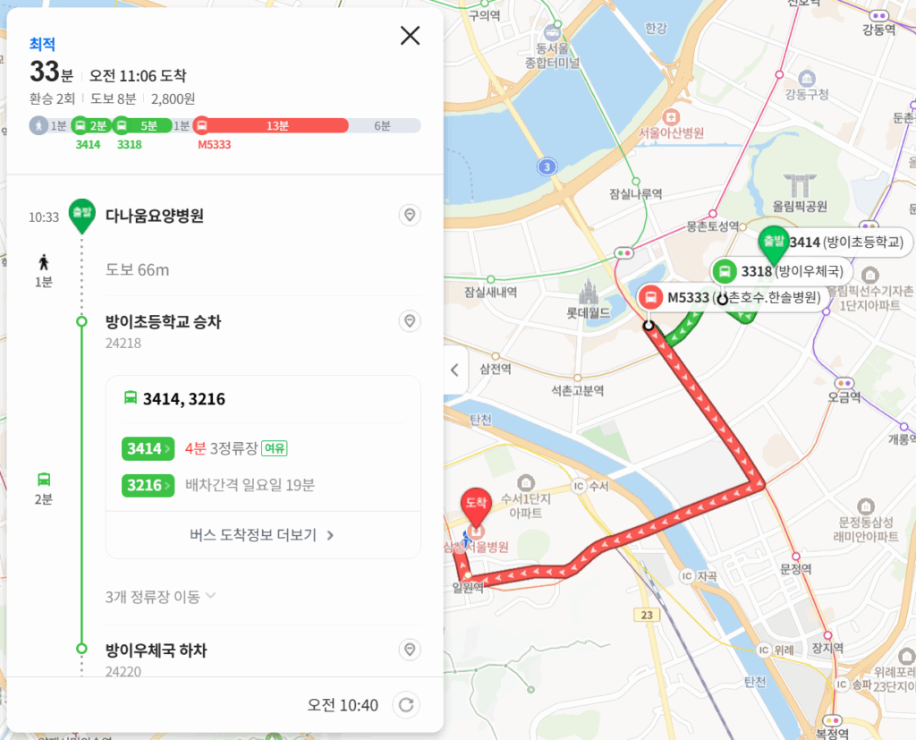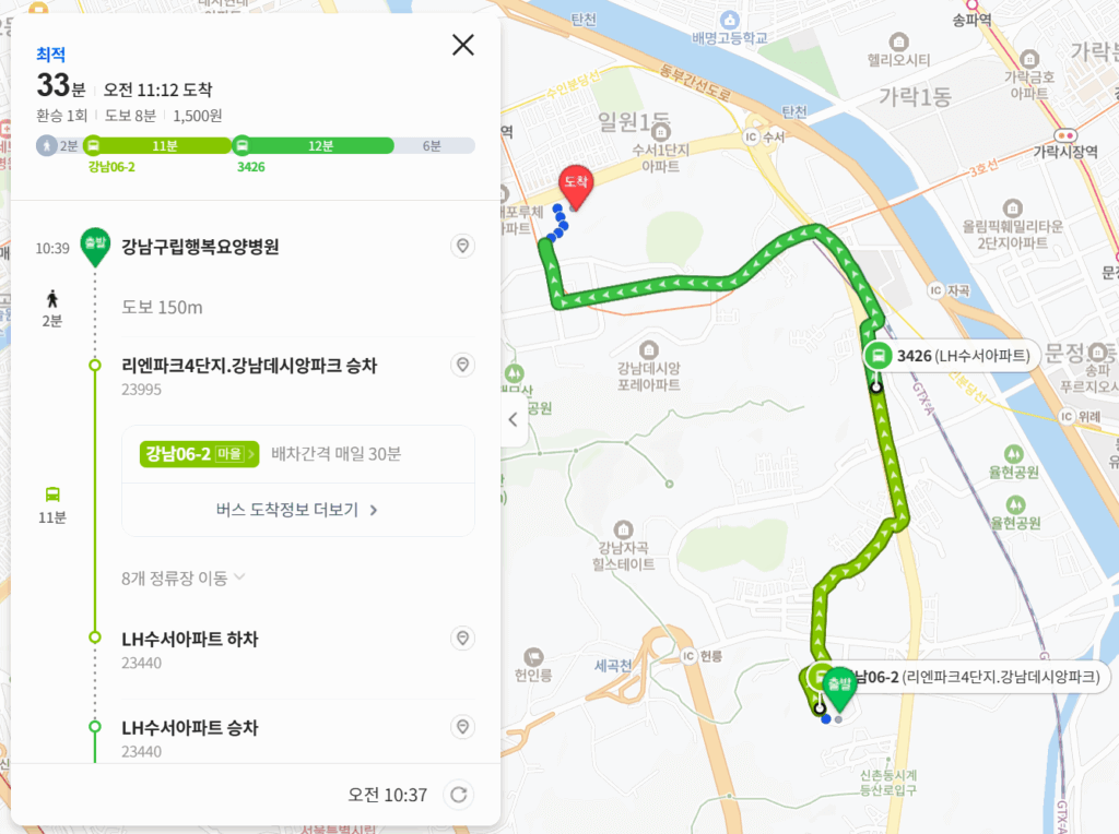 버스를 두 번 갈아타고 삼성서울병원까지 이동시간 33분이 소요된다고 나타납니다. 실제로는 버스 배차 간격 때문에 이보다 훨씬 더 걸릴 것으로 예상됩니다.
