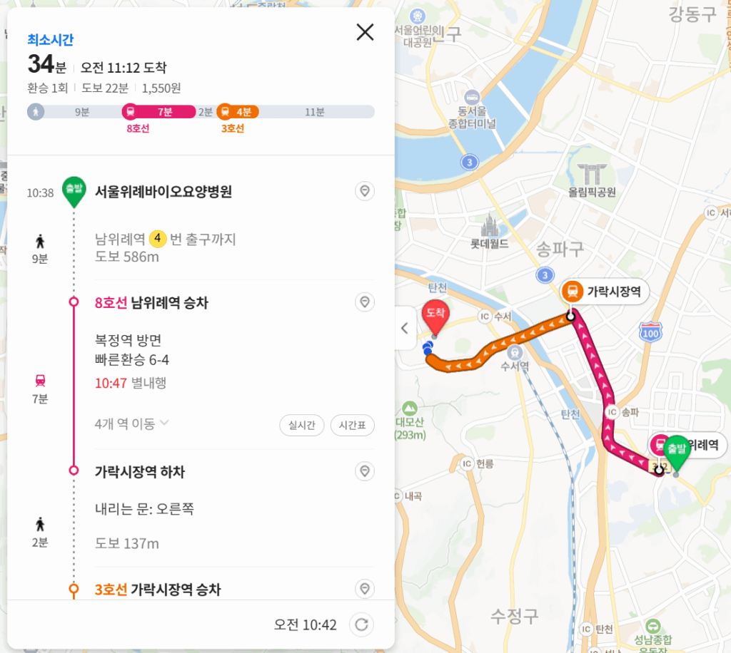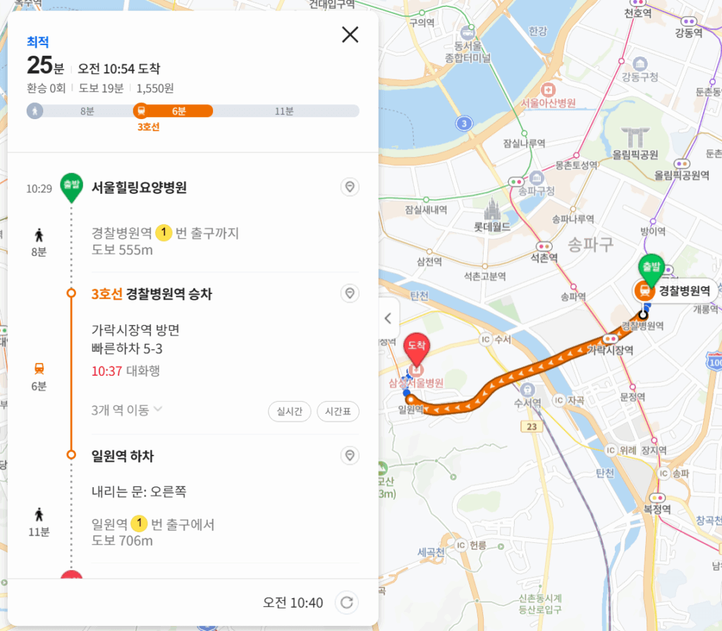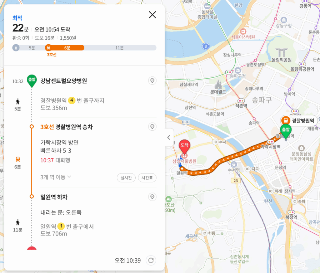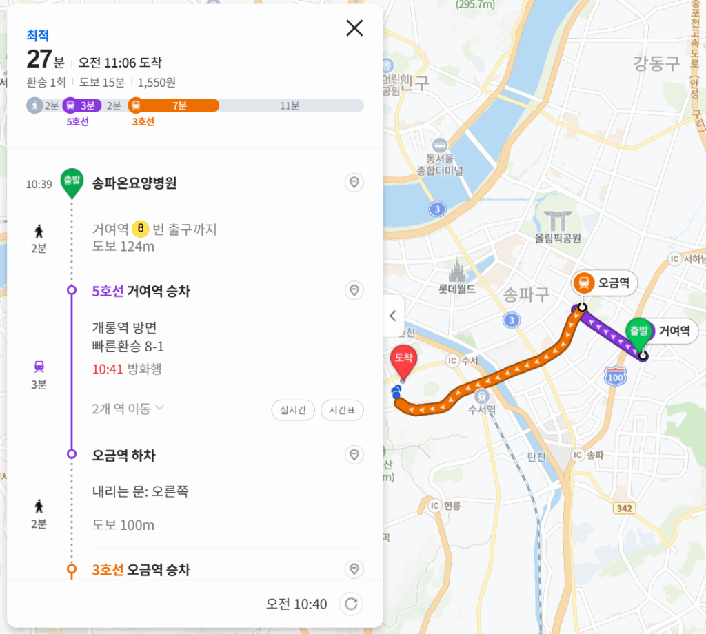 요양병원 한 블럭 옆에 지하철역 입구가 있습니다. 5호선을 타고 거여역에서 오금역에서 하차한 후 3호선으로 갈아타면 삼성서울병원까지 이동시간 총 27분이 소요됩니다.