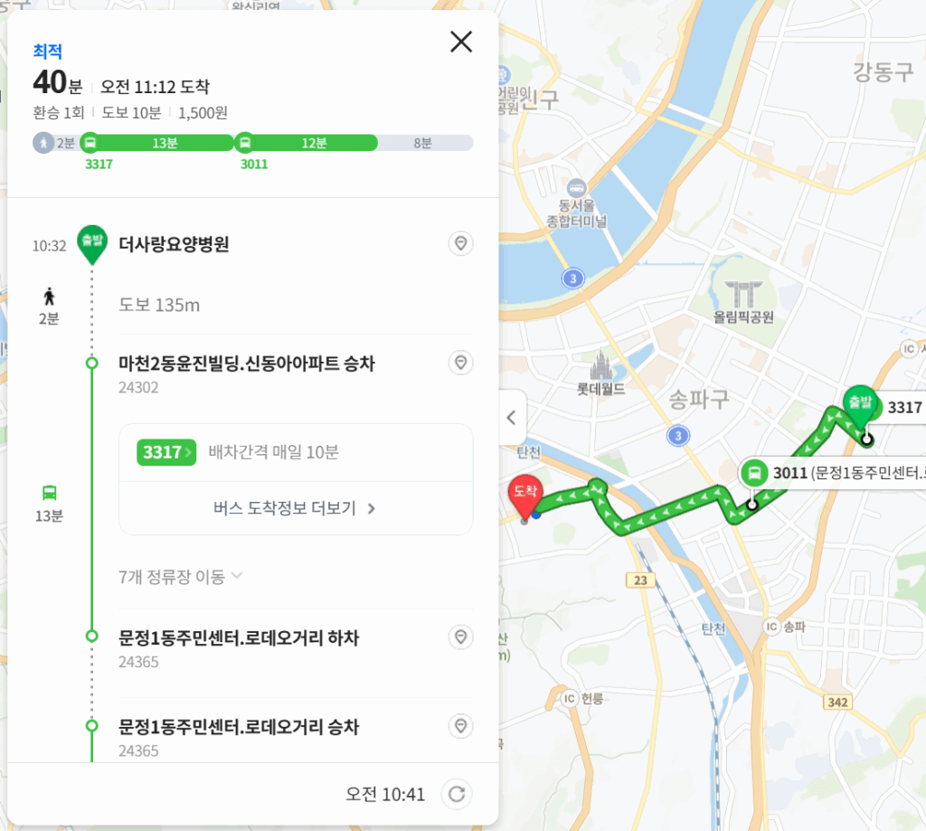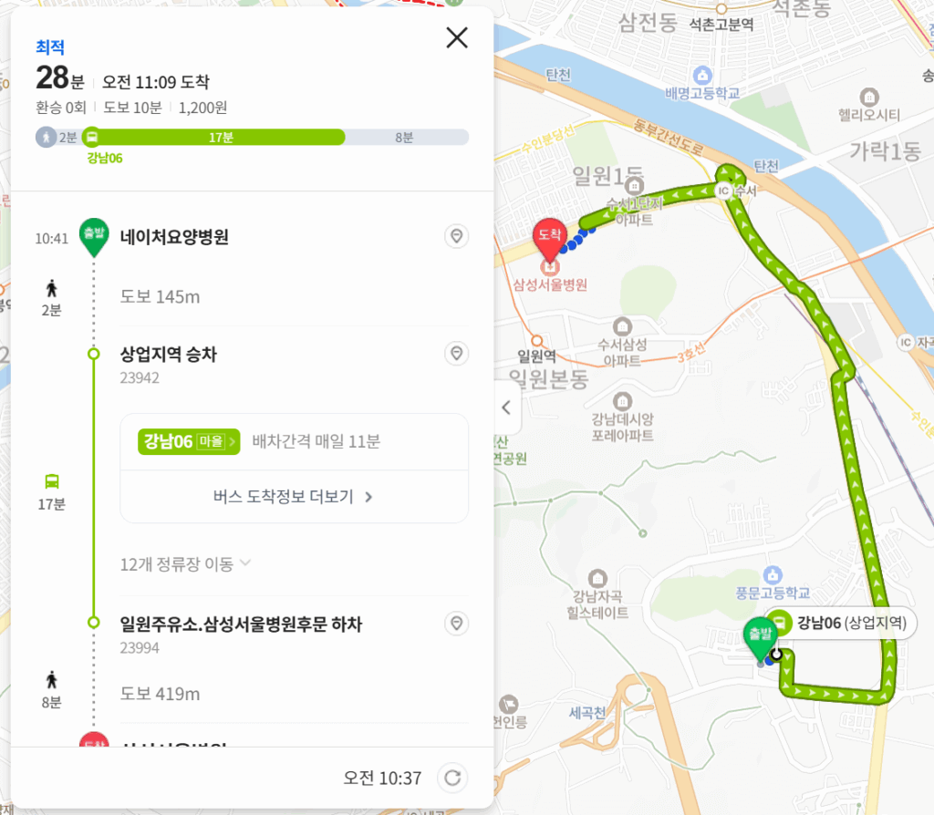 병원으로 이동하는 시간이 28분 소요됩니다. 도보 이동 시간이 짧고 버스 배차 간격이 11분이라서 이동이 편합니다.