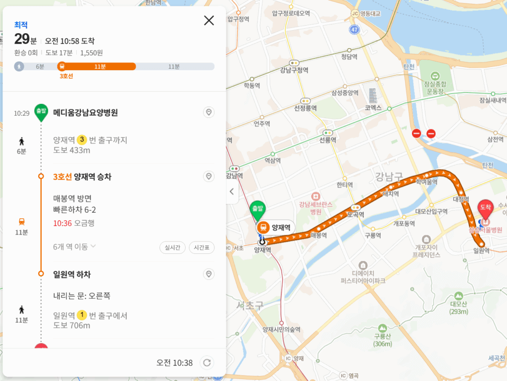 메디움강남요양병원은 양재역 근처에 있어 지하철 3호선을 타고 한번에 삼성서울병원까지 이동할 수 있습니다. 도보 17분을 포함하여 삼성서울병원까지 약 29분이 소요됩니다.